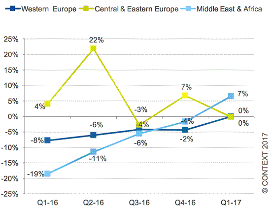 Объем поставок (в штуках) принтерного оборудования в регион EMEA стабилизировался в 1 квартале 2017 года, продемонстрировав рост на 1% за год в отличие от снижения на 8% в том же квартале в прошлом году, сообщает британская аналитическая фирма CONTEXT, занимающаяся изучением европейского ИТ-рынка. Главным драйвером продаж были многофункциональные устройства.
