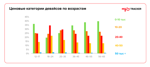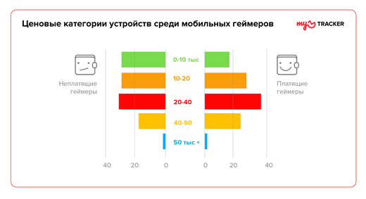 Платящие мобильные геймеры в основном используют дорогие устройства, чья цена превышает 20 тысяч рублей. При этом доля дешевых девайсов (до 10 тыс) у платящих игроков составляет всего 15%. Самые дорогие модели выбирают пользователи из сегмента