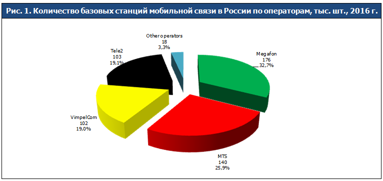 По оценкам J’son & Partners Consulting, доля затрат российских операторов мобильной связи операторов на аренду площадок (сайтов) для размещения базовых станций у различных арендодателей (коммерческие структуры, муниципальные и государственные предприятия, частные лица) составляет около 60% всех затрат на аренду технологических позиций (транспортные сети, оборудование фиксированной связи и пр.). По итогам 2016 года затраты на аренду почти 200 тыс. сайтов для размещения базовых станций увеличилась у операторов «большой четверки» почти на 11% и составила около 58 млрд руб. При этом самые высокие затраты на аренду были у «МегаФона» и МТС, которые лидируют по количеству базовых станций в России (Рис. 1).