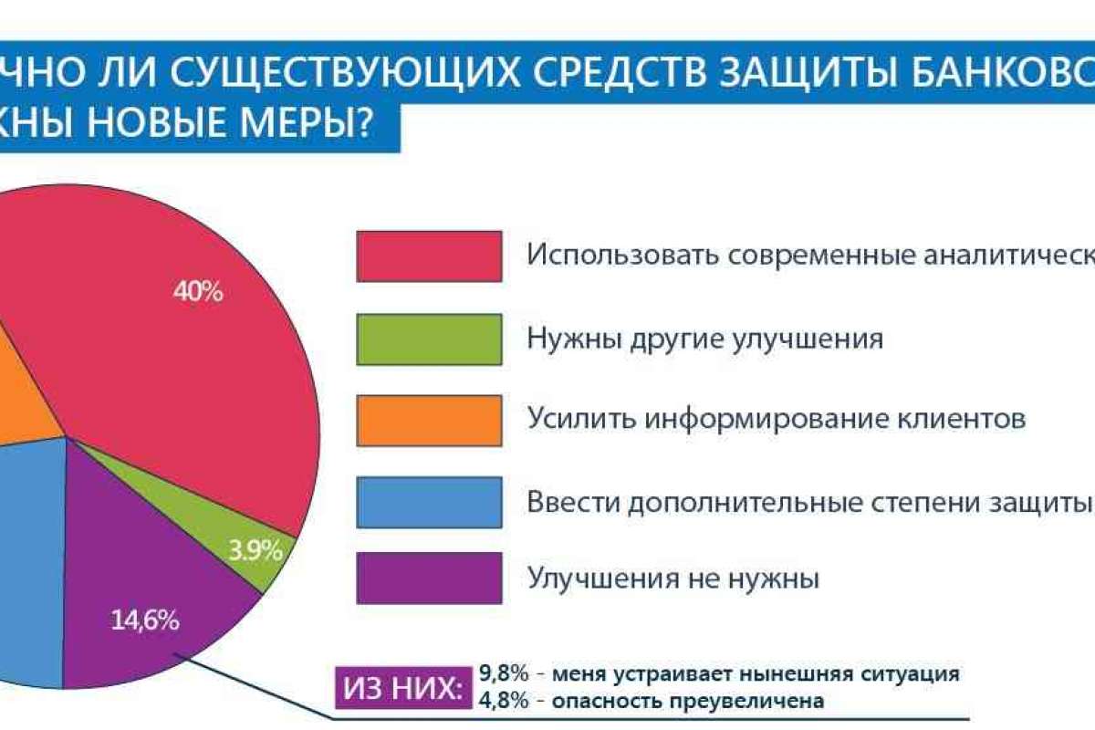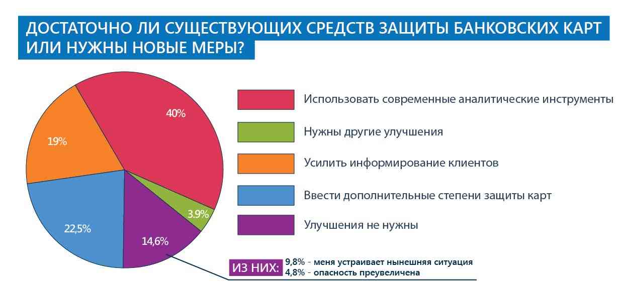 Опрос SAS и banki.ru показывает, что уровень подобной защиты волнует не только регулятора, но и самих пользователей — лишь 14,6% считают, что необходимости в дополнительных мерах нет. Треть из них (около 4,8% от общего числа опрошенных) заявили, что опасность преувеличена и что нужно перестать перестраховываться, а остальные (около 9,8% от общего числа) просто удовлетворены тем уровнем защиты, который обеспечивает их банк.