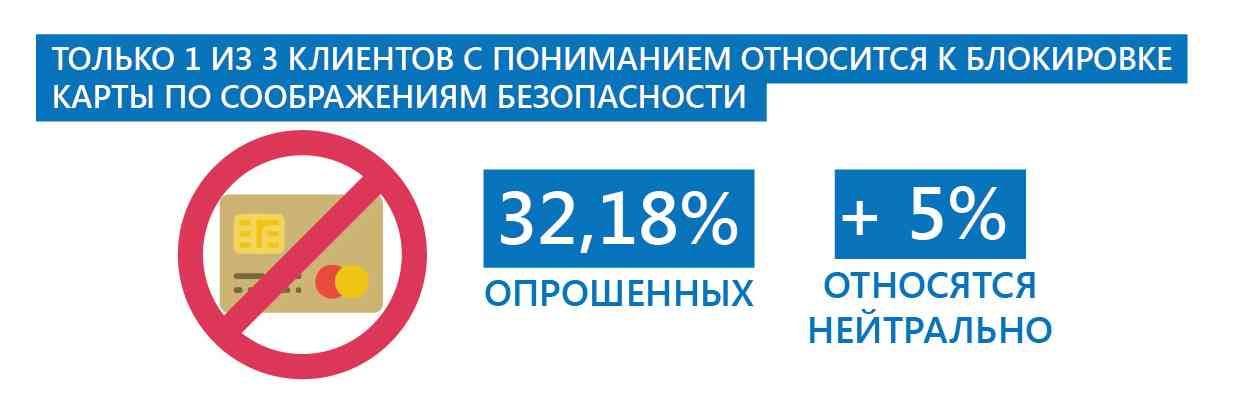 Стоит отметить и то, что держатели банковских карт не хотят лишних неудобств даже ради защиты собственных средств: лишь 32,18% держателей карт с пониманием относятся к блокировкам карты по соображениям безопасности, а еще около 5% проявили нейтральное отношение. Все остальные выразили ту или иную степень недовольства вплоть до крайнего отрицания (около 7%) либо затруднились дать ответ.