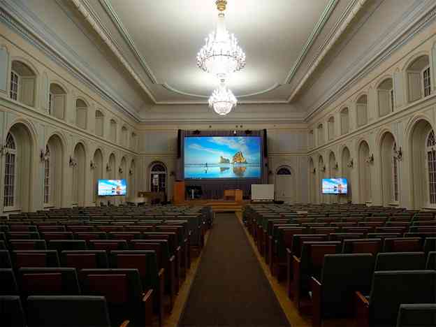 Диалог спикеров и зала обеспечивает дискуссионная система, а говорить на одном языке всем присутствующим помогает система синхронного перевода. Если выступающий географически находится в другом месте, эффект присутствия создается средствами видеоконференцсвязи, а благодаря акустической системе мощностью 11 кВт речь спикеров отчетливо слышна даже в последних рядах.