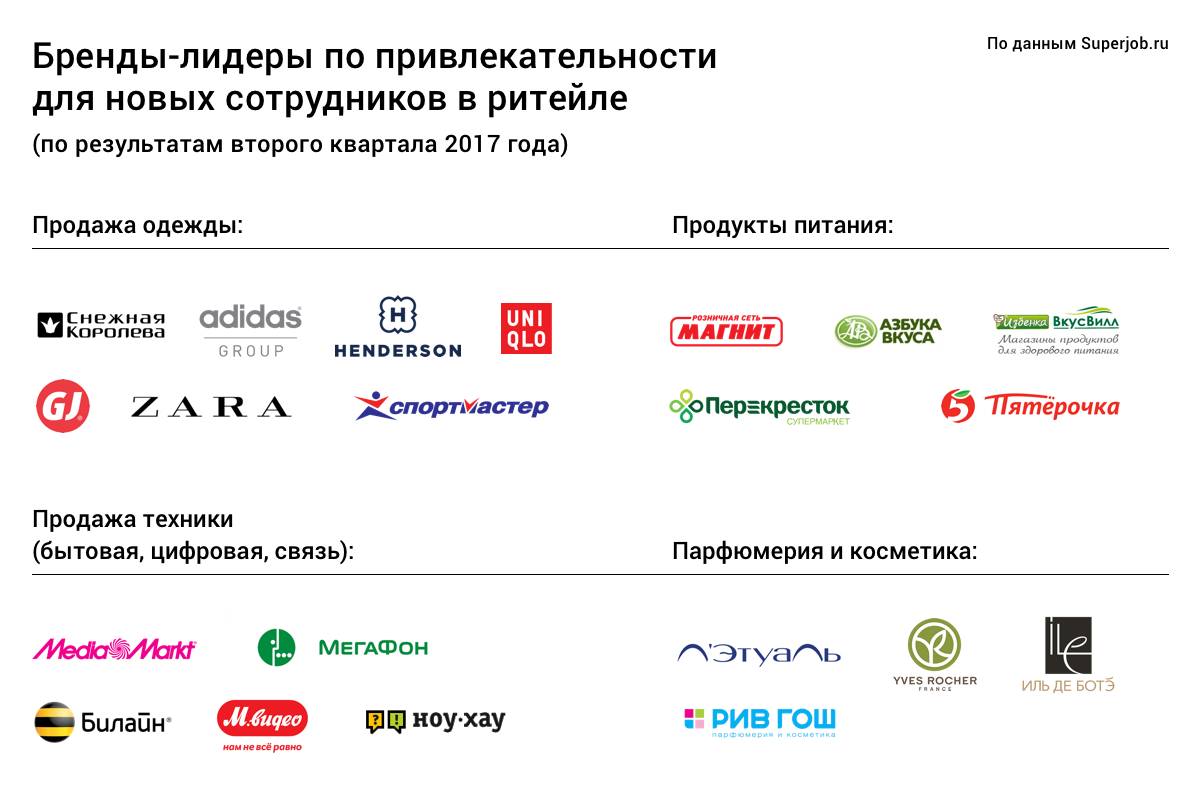 Superjob составил топ брендов российского ритейла, наиболее привлекательных для претендентов на позицию «продавец-консультант» во втором квартале 2017 года. Позиция «продавец-консультант» была выбрана как самая массовая в отрасли, а в качестве основного показателя спроса со стороны кандидатов взято количество откликов на вакансию, сделанных кандидатами самостоятельно.