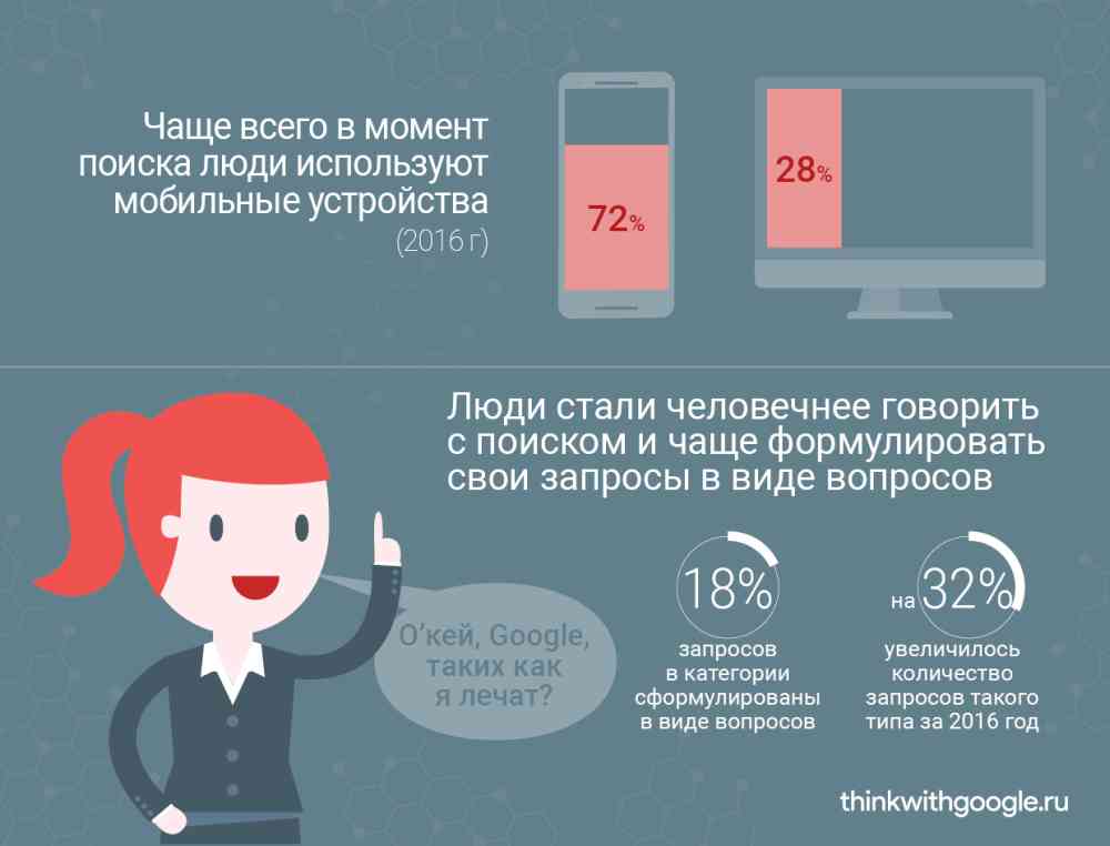 В последнее время меняются подходы к поиску информации в категории «Боль». Преимущественно в момент поиска люди используют мобильные устройства: в 2016 году 72% запросов пришлось на смартфоны, тогда как всего 28% — на компьютеры и планшеты. Люди стали человечнее говорить с поиском и чаще формулировать свои запросы в виде вопросов — количество таких запросов выросло на 32% за 2016 год и сейчас оно составляет 18%.