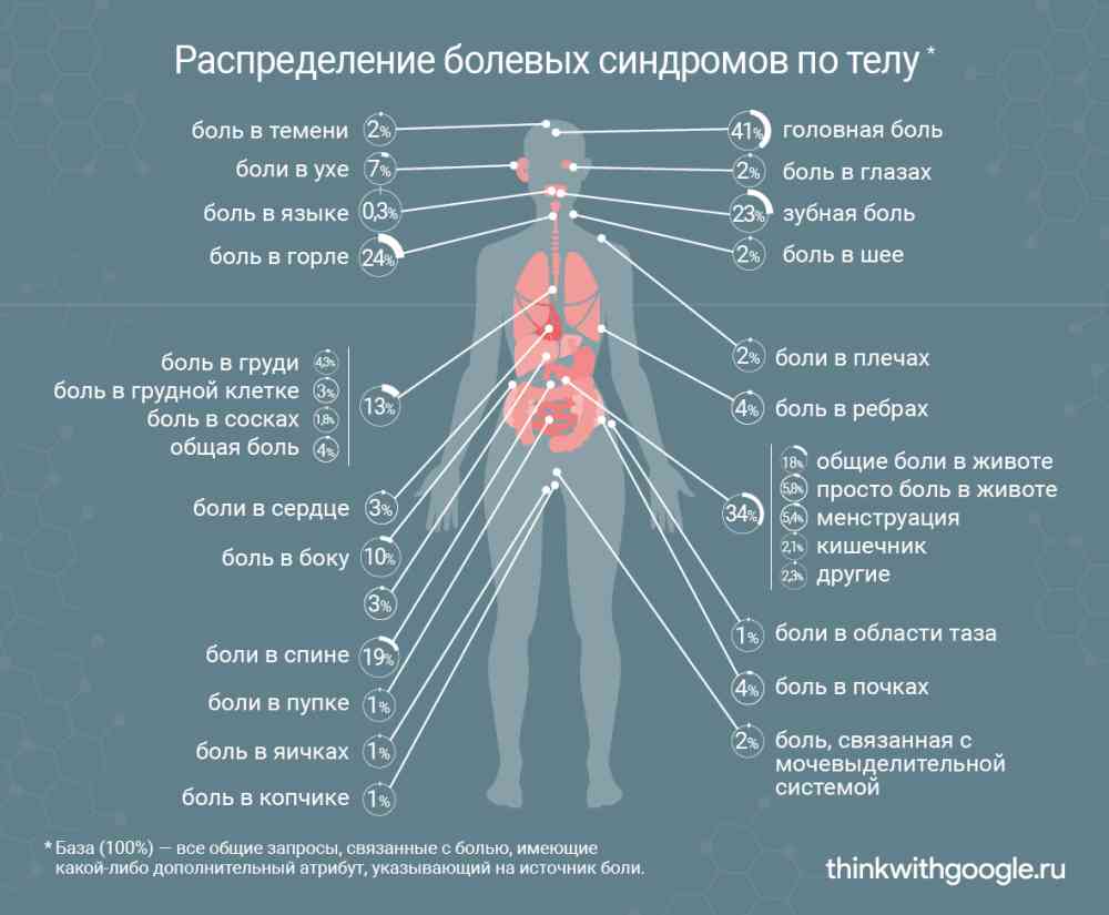 Большинство (9 из 10) запросов про боль относятся к определенной части тела: голове (35%), телу (56%), ноге (8%), руке (1%). При этом, когда речь идет о голове, подразумевается не только мигрень, но и боль в горле, зубная боль, боль в ухе, шее или глазах. С телом чаще всего связана боль в животе, спине, груди, боку, реже — в ребрах, почках, сердце и печени.