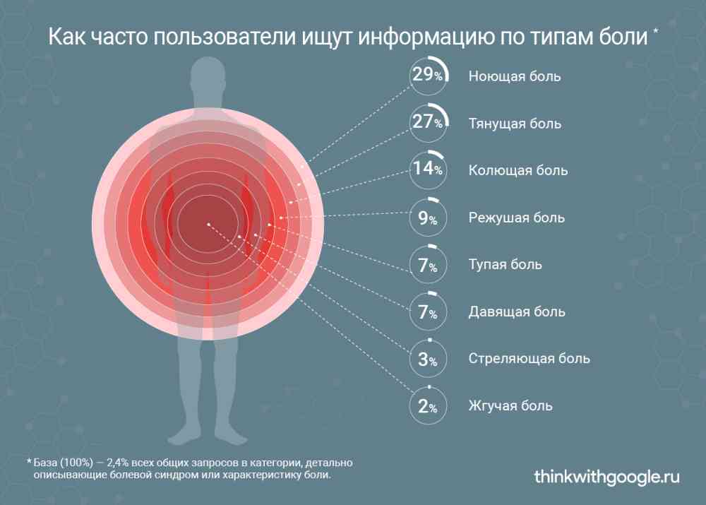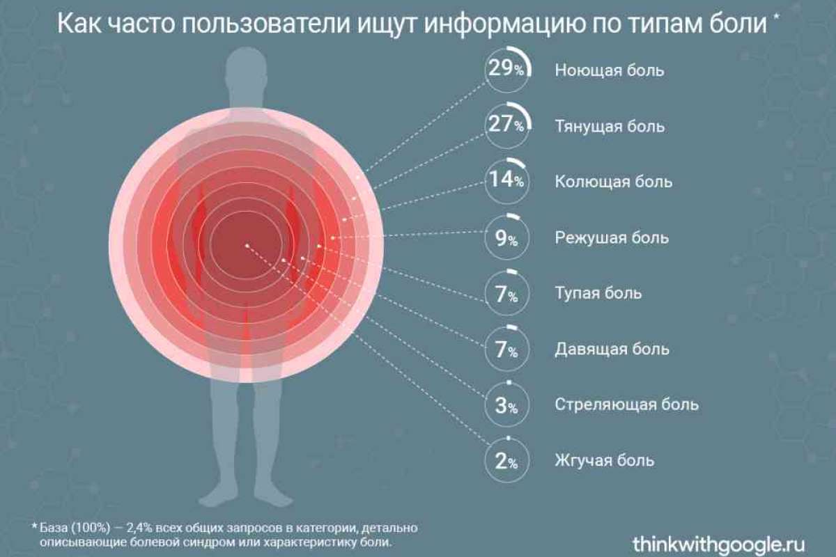 В момент поиска информации в интернете пользователи крайне редко описывают болевой синдром детально или придают боли четкую характеристику — таких запросов только 2,4%. Чаще всего людей беспокоит ноющая, тянущая и колющая боль, в более редких случаях — режущая, тупая и давящая боль.