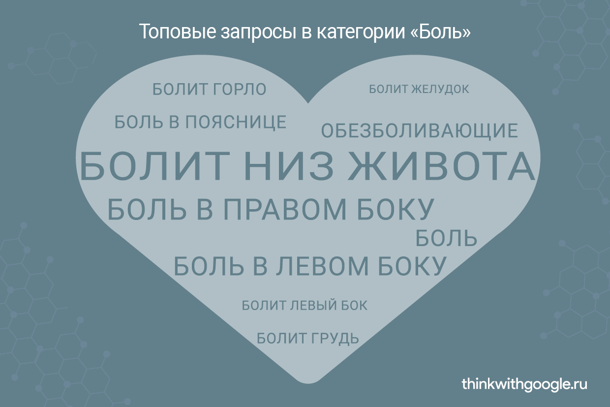 Компания Google провела исследование поисковых запросов и выяснила, что болит у российских интернет-пользователей и как они привыкли с этим справляться. Интерес россиян к этой теме в течение последних пяти лет постоянно растет, и в 2016 году количество запросов, связанных с болью, достигло 27 миллионов. Среди наиболее распространенных жалоб — боль внизу живота, в боку, в пояснице, в горле, в груди и в желудке.