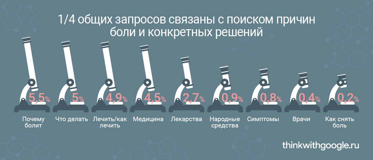 Анализ данных Google показывает, что три четверти (75%) запросов в этой категории — это общие запросы, исследующие само понятие боли, ее виды и причины. Тогда как только 25% запросов сформулированы более конкретно и связаны в основном с препаратами, избавляющими от этой проблемы. Чаще всего людей интересует, почему возникает боль, что делать в этом случае, каковы способы лечения, какие лекарства могут помочь. Значительно реже пользователи спрашивают о народных средствах, симптомах и докторах.