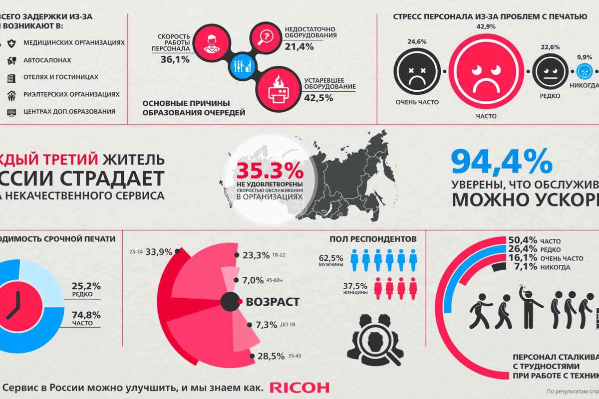 Компания Ricoh в июле 2017 года провела исследование, в котором участвовали 1043 человека, и выяснила, почему россиянам приходится тратить время в очередях в коммерческих организациях. Проводимое исследование носило описательный характер, и было ориентировано на определение и описание уровня качества предоставляемых услуг. Опрос показал, что большая часть задержек при обслуживании клиентов связана с проблемами в работе оборудования, в том числе из-за сложности его настройки.