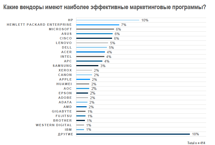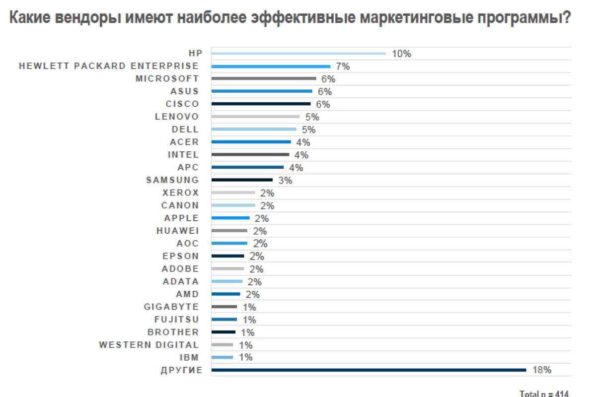 Мы уже писали о масштабном исследовании СhannelWatch June 2017, проведенном агентством CONTEXT. В рамках этого исследования представители российского ИТ-канала назвали вендоров с самыми эффективными маркетинговыми программами (респондентам было предложено выбрать трех вендоров). По их мнению, в этом направлении лидирует HP (рис. 1).
