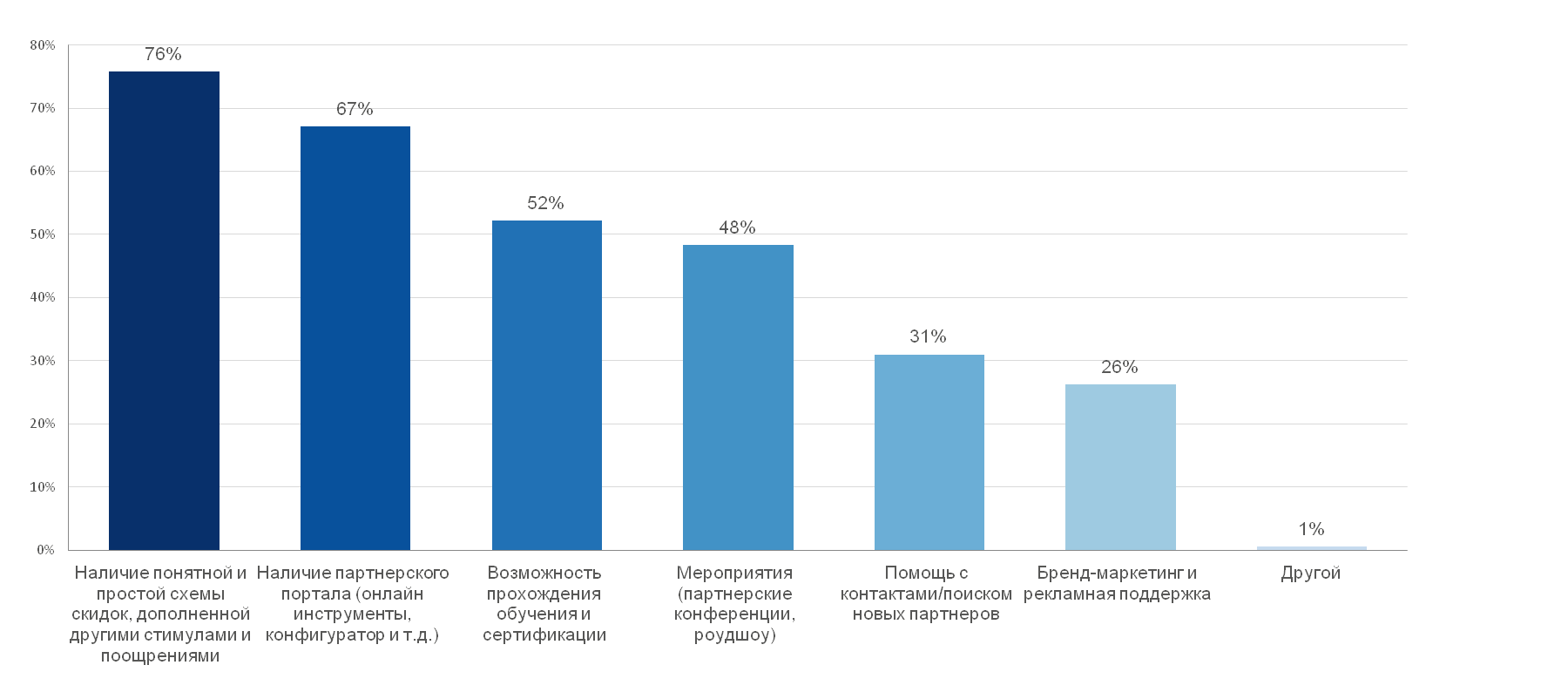 На вопрос «Что для вас наиболее важно в маркетинговой программе для канала» респонденты ответили следующим образом: наличие простой и понятной системы скидок, наличие партнерского портала, возможность прохождения обучения и сертификации и партнерские мероприятия (рис. 2).