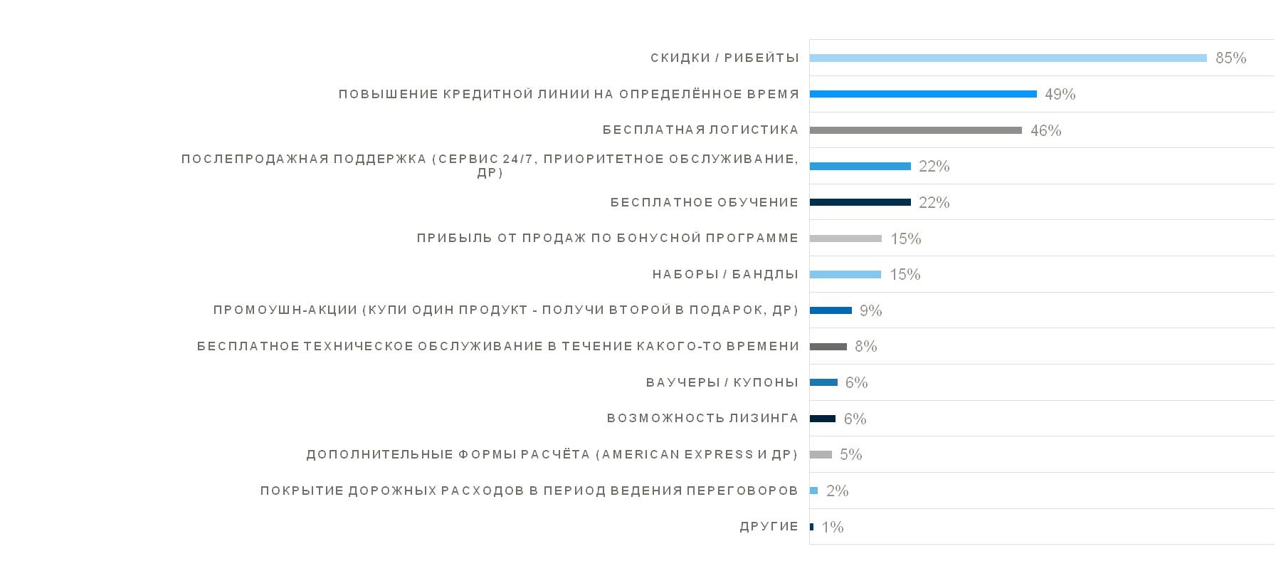 Наиболее важными стимулами для канала являются скидки и рибейты (85% ответов), что вполне ожидаемо. Кроме того, реселлеры ценят повышение кредитной линии (49%) и бесплатную логистику (46%) (рис. 3).
