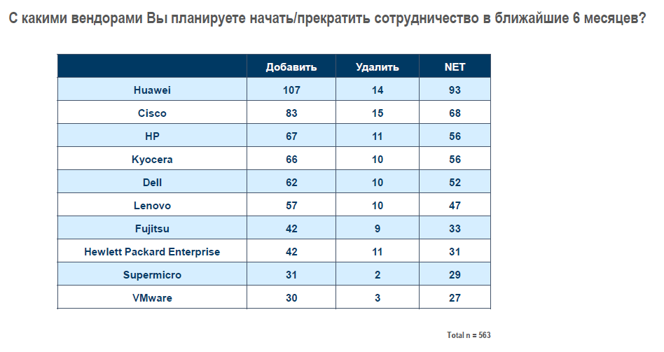 Во время исследования респондентам был также предложен вопрос о том, с кем из вендоров они планируют начать или прекратить сотрудничество в ближайшие полгода. Наиболее интересным вендором оказался Huawei (рис. 4).