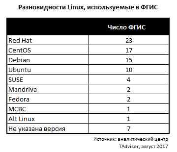 Наиболее популярной ОС с открытым исходным кодом является продукт американской компании Red Hat. На его базе функционирует оборудование 23 ФГИС (25 в 2015 году). Доли других ОС приведены в таблице.