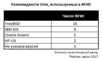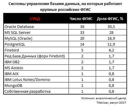 В ходе исследования, проведенного TAdviser в августе 2017 года, были изучены все системы, содержащиеся в реестре федеральных ИТ-систем. В каждой из них аналитики выделяли базовые продукты, на которых они построены — системы управления базами данных (СУБД) и серверные операционные системы (ОС).