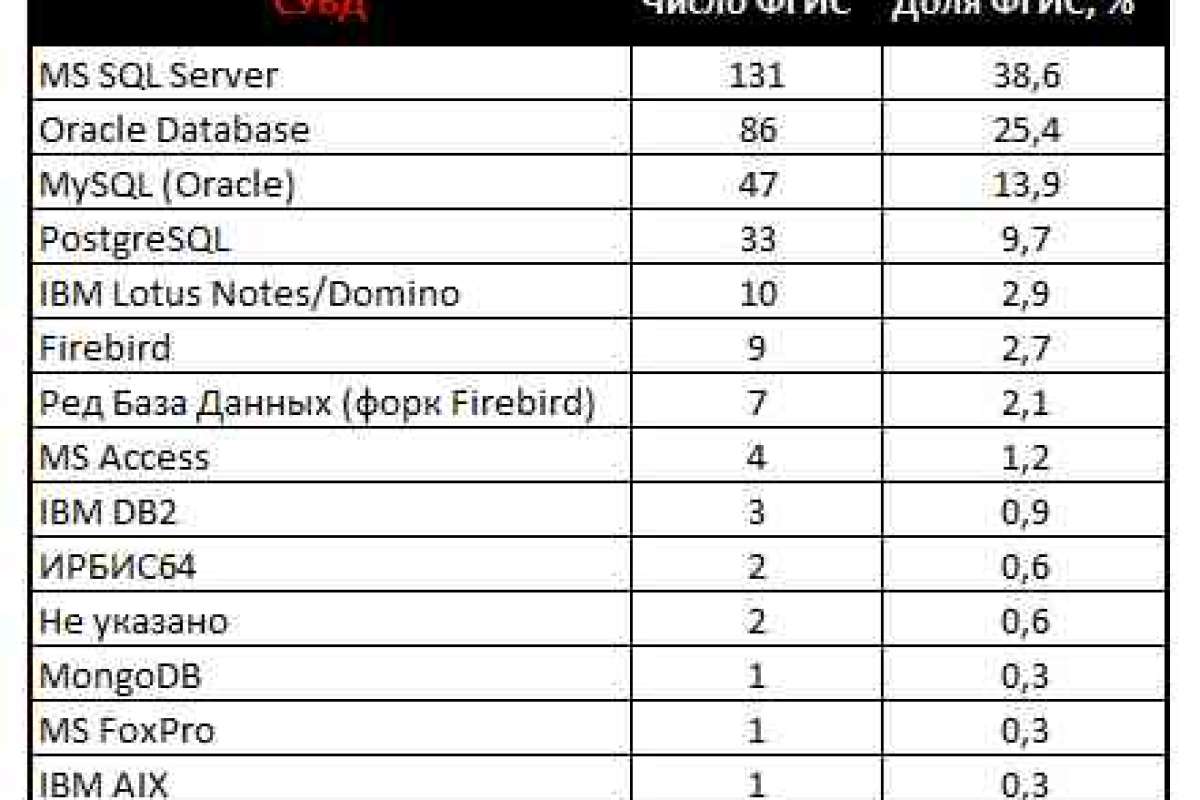СУБД с открытым исходным кодом MySQL (развивается и поддерживается Oracle) и PostgreSQL заметно менее популярны — на них построено 47 (13,9%) и 33 (9,7%) ФГИС, соответственно.