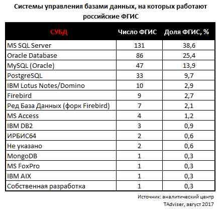 Продукты Microsoft и Oracle, как и прежде, занимают лидирующие позиции в списке наиболее популярных СУБД, применяемых для построения ФГИС.