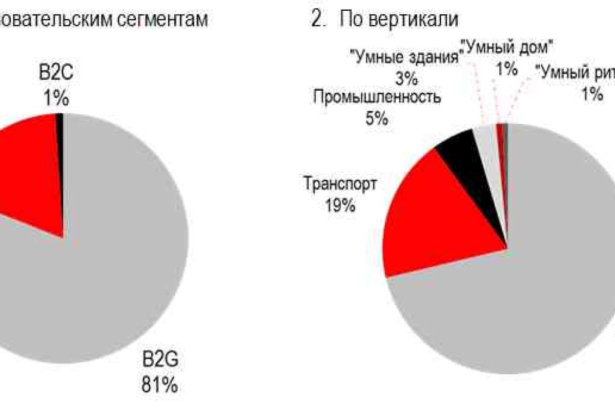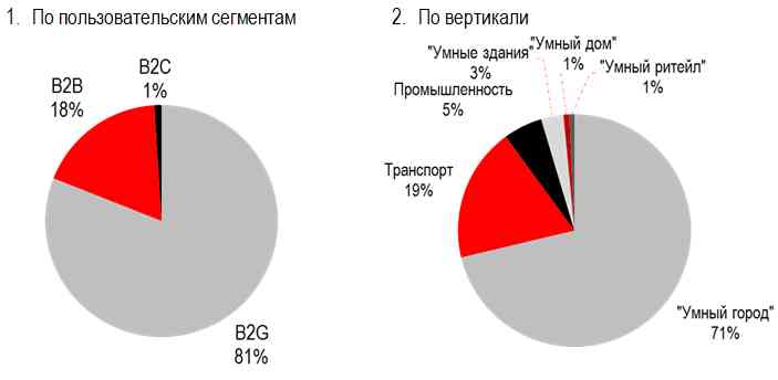 При этом резко выделяется роль государственного сектора (В2G), представленного решениями «умного города» и частично внедрениями телематических решений на транспорте. Согласно оценкам iKS-Consulting, сегмент B2G генерирует более 80% всех доходов российского рынка IoT. Помимо прямого спроса на решения со стороны государственного сектора, государство также играет заметную роль в стимулировании развития IoT в качестве регулятора. К примеру, в розничной торговле, распространению различных IoT-решений способствуют такие нормативно-правовые изменения как поэтапное внедрение системы маркировки товаров, изменения в правилах отображения цены, реформа использования контрольно-кассовых аппаратов и т.д.