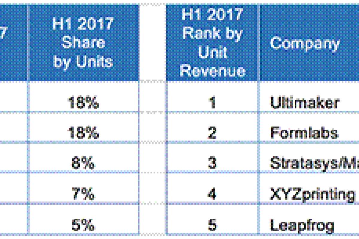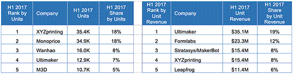 Помимо Monoprice и XYZprinting следует назвать и другие восходящие звезды мирового рынка — это компании Wanhao, Formlabs Prusa Research, Dagoma и Markforged; все они продемонстрировали рост поставок более 50% за год в первой половине года.