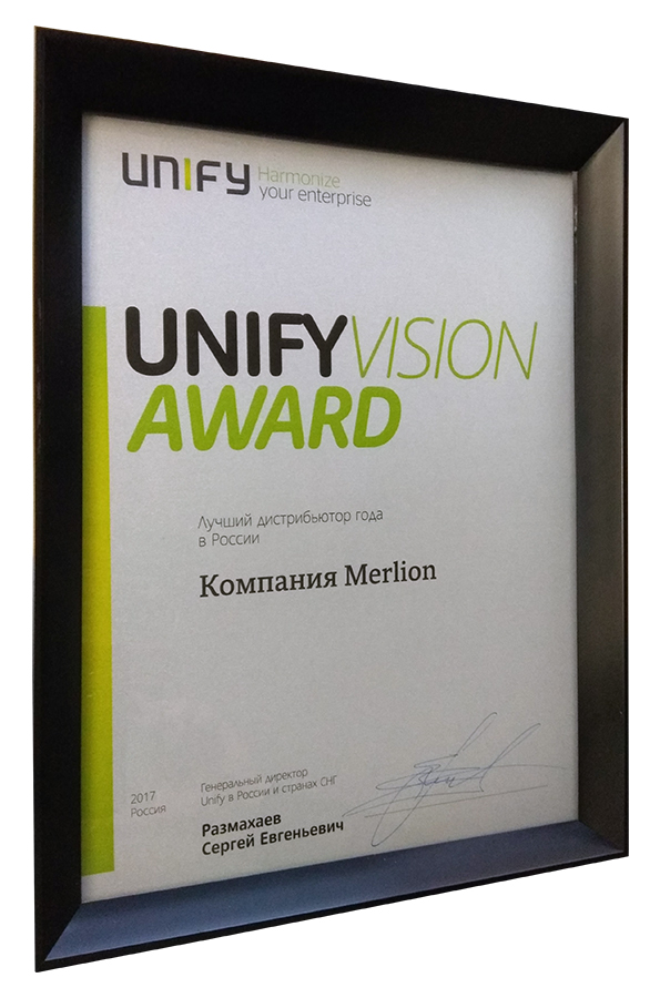 Награда компании MERLION как лучшему дистрибьютору Unify по итогам работы в 2016 году была вручена на ежегодном мероприятии Unify Vision Day главой российского представительства Сергеем Размахаевым. MERLION показал лучшие результаты по обороту среди всех прямых партнеров вендора. При этом рост поставок решений Unify, по сравнению с 2015 годом, составил в компании MERLION около 50%. Ключевыми заказчиками решений Unify, сотрудничающими с партнерами MERLION, традиционно выступают компании из финансового сектора, а также торговые предприятия, в том числе крупнейшие федеральные розничные сети. Значительная часть поставок пришлась и на спортивные объекты, которые строятся в России специально к Чемпионату мира по футболу, который пройдет в 2018 году.