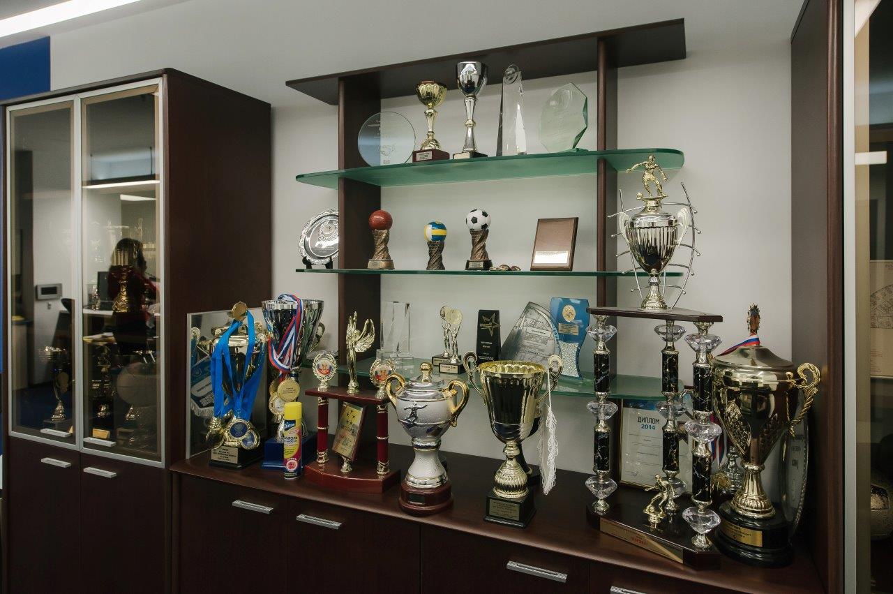 Небольшое пространство возле ресепшна выделено для демонстрации спортивных достижений компании. В ИТ-среде широко известна приверженность «Марвела» к самому популярному виду спорта на планете, поэтому за многие годы накопилось значительное количество футбольных кубков, медалей и разных других наград.