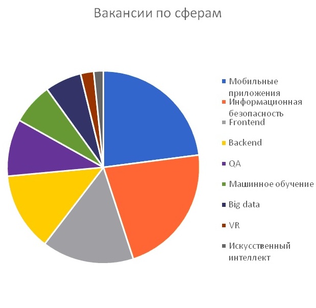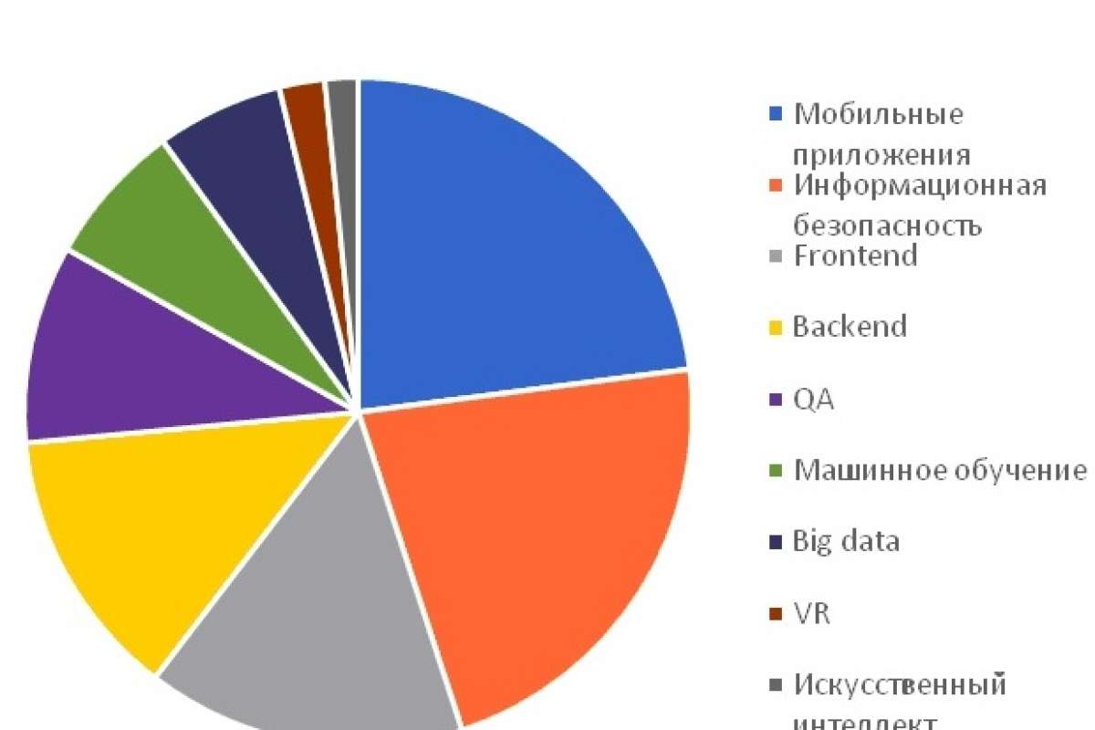 Наибольший спрос на ИТ-специалистов наблюдается в разработке мобильных приложений и информационной безопасности — на сегодняшний день в этих сферах открыто почти по 3 тысячи вакансий. Сохраняется устойчивый спрос и на разработчиков frontend и backend (примерно 2000 и 1700 вакансий соответственно). А вот для работы с искусственным интеллектом и виртуальной реальностью требуются сравнительно немного специалистов: всего 209 и 287 открытых вакансий.