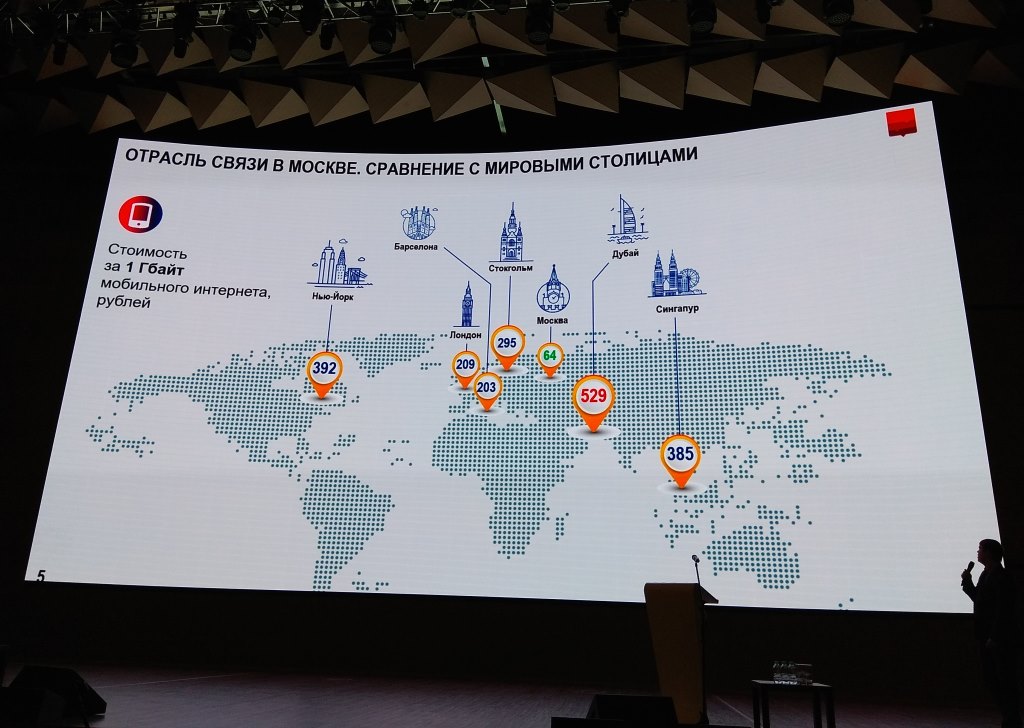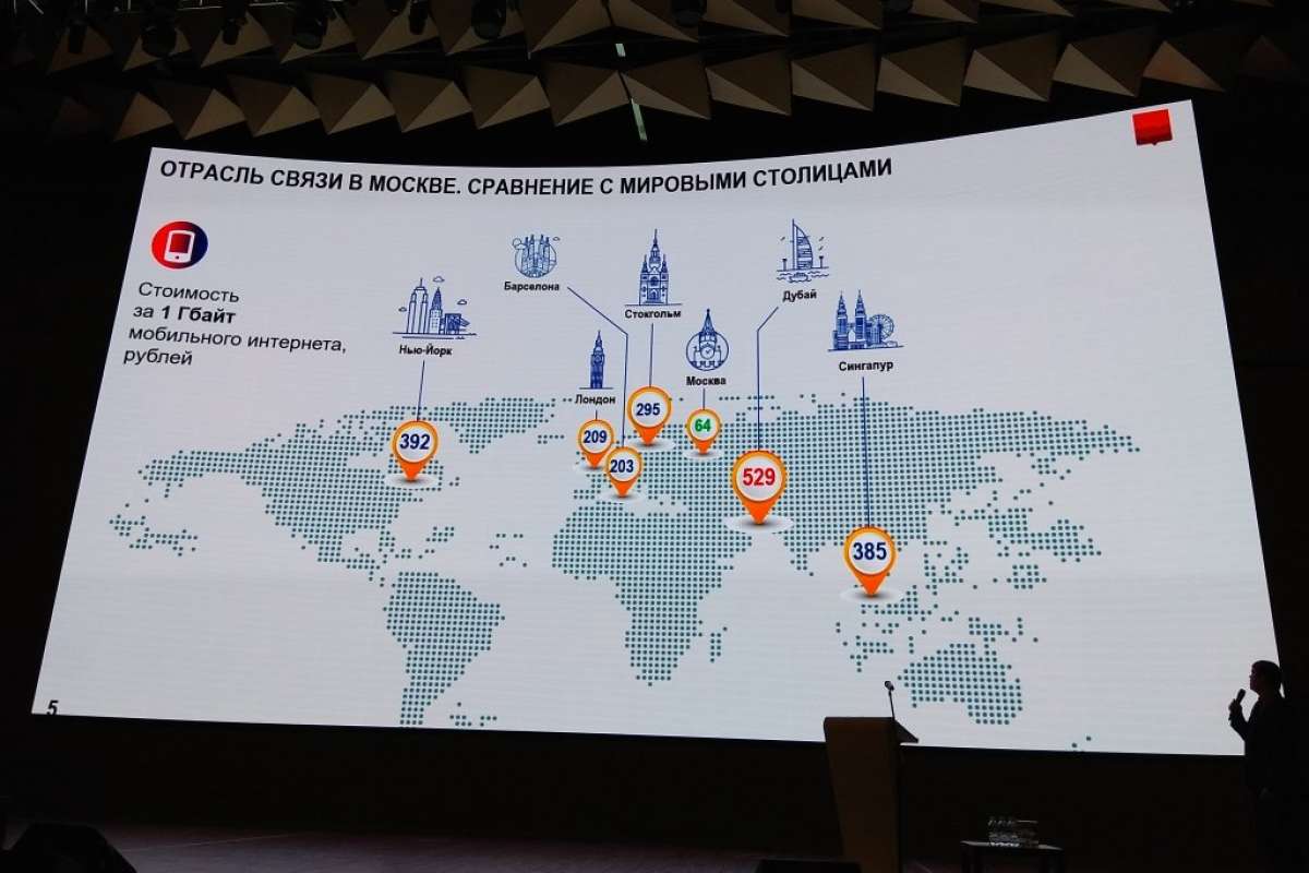 По словам Евгения Альминова, «Связь» до сих пор остается основополагающим сегментом внутри ИКТ-отрасли Москвы. И это при том, что с 2010 по 2017 гг. в денежном выражении рост был не самым значительным — с 1,15 трлн. руб. до 1,47 трлн. руб. (среднегодовой рост в данный период составил 3,6%, а в 2017 по сравнению с 2016 г. он составил всего 0,9%). Но за эти семь лет произошел колоссальный прорыв по уровню проникновения связи и по уровню использования услуг связи. Так, уровень проникновения сотовой связи в Москве вырос со 184% до 234%, а домашнего интернета — с 65% до более чем 90%. В то же время средний месячный мобильный трафик на семью вырос более чем в 20 раз — с 0,4 Гб до более чем 9 Гб, а средняя скорость домашнего интернета повысилась с 5 Мбит/с до более, чем 35 Мбит/с. А пользователи начинают не только потреблять мобильный трафик, но активно его генерить. Интересно и то, что услуги связи в Москве оказываются самыми доступными не только с технической точки зрения, но и по цене (см. фото) в мире.