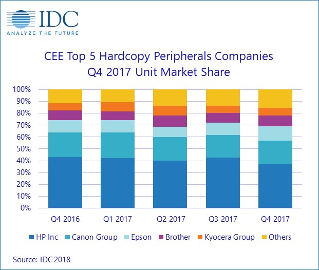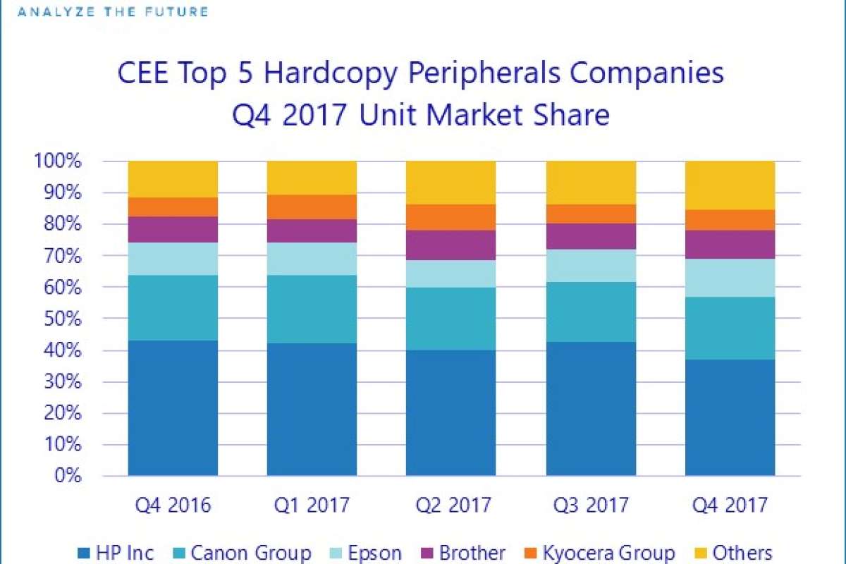 Что касается распределения мест вендоров, то HP Inc. оставалась лидером рынка устройств печати в целом в регионе CEE в 4 квартале; ее доля рынка по объему составила почти 37% несмотря на снижение поставок на 13,4% за год. Стоит отметить, что это был первый квартал, когда результаты компании включали продажи как самой HP, так и купленного ею принтерного бизнеса Samsung. При этом поставки собственных принтеров HP продемонстрировали умеренный спад на 7,8%, тогда как продажи моделей с брендом Samsung сократились на более чем 40%.