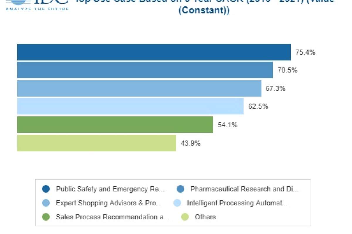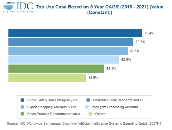Самые большие расходы на когнитивные/ ИИ-системы в 2018 году будут приходиться на автоматизированные агенты обслуживания клиентов (2,4 млрд. долл.), со значительными инвестициями со стороны ритейлеров и телекоммуникационной отрасли; автоматизированные системы анализа и предотвращения киберугроз (1,5 млрд. долл.), где ведущими будут банковский сектор, коммунальные службы и телекоммуникационная отрасль; а также рекомендательные системы автоматизации процесса продаж (1,45 млрд. долл.), где будут лидировать ритейл и медиакомпании. Следующими по сумме мировых расходов в 2018 году будут автоматизированное профилактическое техобслуживание, системы диагностики и терапевтической тактики и анализ и расследование кибермошенничества. Самый быстрый рост расходов на протяжении пятилетнего прогнозного периода будут демонстрировать системы общественной безопасности и реагирования на чрезвычайные ситуации (CAGR 75,4%), изыскание новых лекарственных веществ (CAGR 70,5%) и экспертные советы по шопингу и рекомендации для покупателей (CAGR 67,3%).