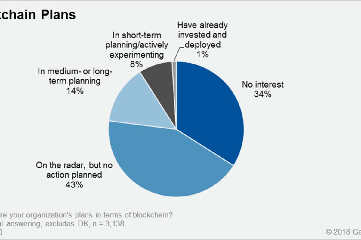 Согласно исследованию Gartner, проведенному среди ИТ-директоров, лишь 1% респондентов указали на какую-либо степень использования блокчейна в их организации, и лишь 8% планируют в ближайшей перспективе внедрять либо уже активно экспериментируют с блокчейном. Более того, 77% опрошенных ИТ-директоров ответили, что в их организации нет интереса к этой технологии и/или не планируется никаких мероприятий по ее изучению или разработке.