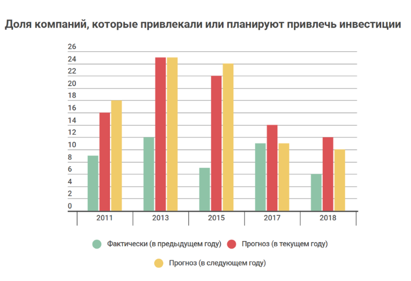 Прошлогодний опрос показал, что 14% компаний ожидали по итогам 2017 г. получить внешнее финансирование. В реальности таковых оказалось только 6%. По объему разница еще больше — вместо прогнозируемых 57,5 млн долл. оказалось 4,5 млн долл. При этом имеется почти четырехкратное сокращение относительно объема инвестиций в 2016 г. (17 млн долл.).