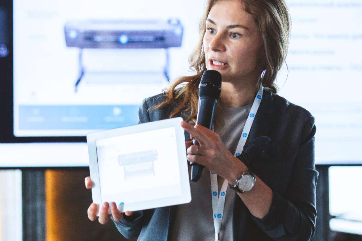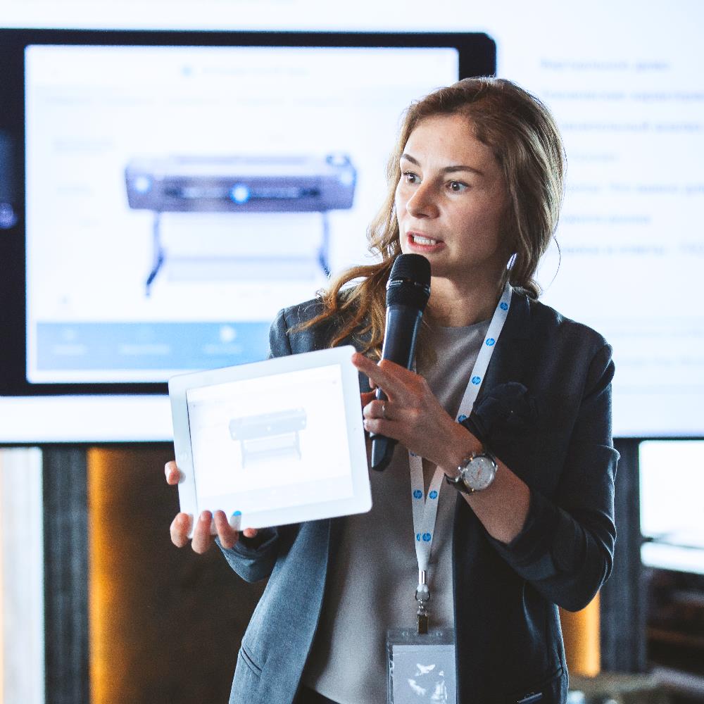 По сравнению с предшественниками физическое разрешение у новинок осталось прежним (до 2400×1200 dpi), а количество цветов чернил стало меньше! Но девайсы научились печатать каплями переменного объема, что позволяет избавиться от «светлых» чернил, попросту размещая точки половинного объема (3 пиколитра вместо стандартных 7 пиколитров), что подчеркнула Наталья Дегтярева (на фото), менеджер по развитию категории широкоформатной печати, HP в России. Важно, что в результате такого подхода значительно — по данным компании, до двух с половиной раз по сравнению с предшественниками — возросла скорость печати новых DesignJet.