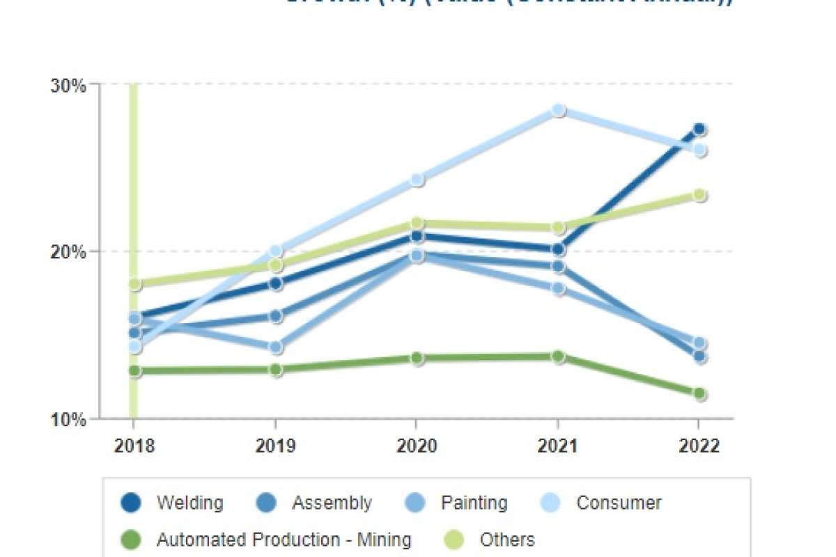 Конкретные применения, на долю которых будет приходиться самая большая часть расходов на робототехнику и дроны, зависят от конкретных отраслей. На долю главного применения робототехники в дискретном производстве — сварки — будет приходиться более 15% всех мировых расходов в этой категории на протяжении прогнозного периода. Другими применениями робототехники, расходы на которые также будут расти, являются сборка, покраска, приготовление смесей, автоматизация в добыче полезных ископаемых, а также комплектация и упаковка. Самый быстрый рост расходов на робототехнику в прогнозный период будут демонстрировать такие применения, как перевозка тарных и штучных грузов (CAGR 53,4%), стеллажное хранение (CAGR 45,6%) и клиентское обслуживание (CAGR 42,0%). Что касается дронов, то самый быстрый рост будут демонстрировать распыление пестицидов и удобрений (CAGR 109,4%), аварийно-спасательные службы (CAGR 86,4%) и точная разведка/ оценка урожая в сельском хозяйстве (CAGR 86,1%).