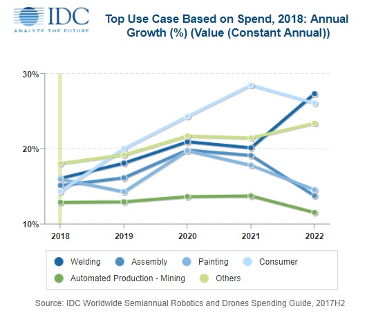 Ожидается, что расходы на робототехнику в 2018 году составят 86,6 млрд долл. и будут составлять более 85% всех расходов на протяжении пятилетнего прогнозного периода. На долю промышленных решений будет приходиться самая большая часть расходов в этой категории (более 57%); далее следуют роботы для сферы услуг и потребительские роботы. Дискретное и непрерывное производство будут главными отраслями по объему расходов на робототехнику — в 2018 году они составят более 54 млрд долл. (совокупно). Сырьевые отрасли и здравоохранение также сделают значительные инвестиции в робототехнику в этом году. Ритейл и оптовая торговля будут демонстрировать самый быстрый рост расходов на робототехнику в прогнозный период (CAGR 32,7% и 30,7% соответственно).