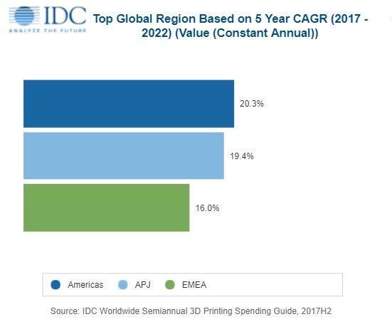 Соединенные Штаты будут регионом с самой большой общей суммой расходов в 2019 году (5,4 млрд долл.); следом идет Западная Европа (4,0 млрд долл.). На долю этих двух регионов совокупно будет приходиться почти две трети всех мировых расходов на 3D-печать на протяжении прогнозного периода. Китай будет третьим крупнейшим регионом с суммой расходов более 1,9 млрд долл.; далее следуют Азиатско-Тихоокеанский регион (за исключением Японии), Центральная и Восточная Европа (CEE) и Ближний Восток и Африка (MEA).