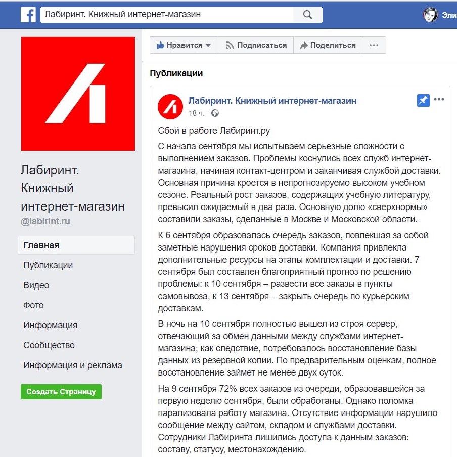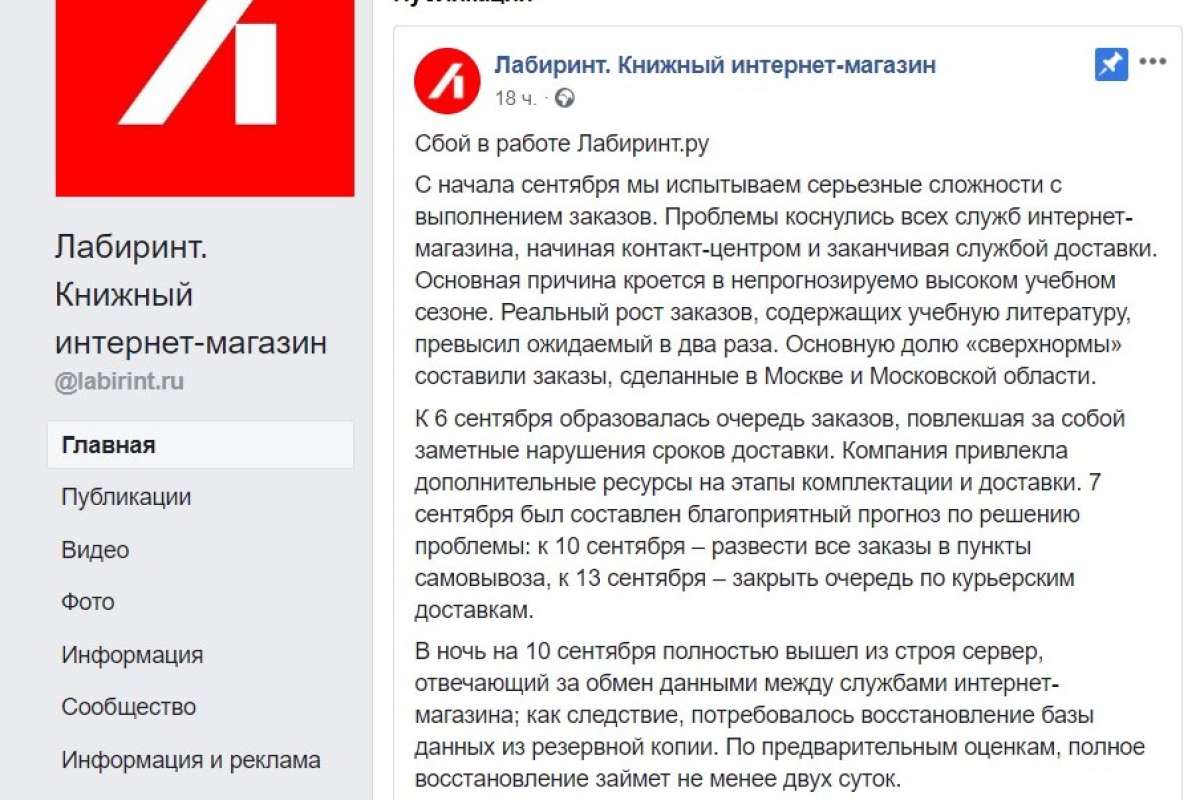 На 9 сентября 72% всех заказов из очереди, образовавшейся за первую неделю сентября, были обработаны. Однако поломка парализовала работу магазина. Отсутствие информации нарушило сообщение между сайтом, складом и службами доставки. Сотрудники Лабиринта лишились доступа к данным заказов: составу, статусу, местонахождению.