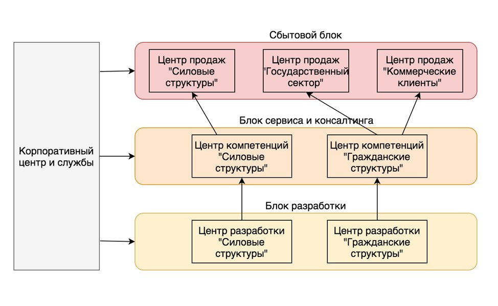 Соответственно, формируется 3 дивизиона — центра продаж и держателей контрактов, которые обслуживают 3 сегмента «Силовой», «Государственный» и «Частный».