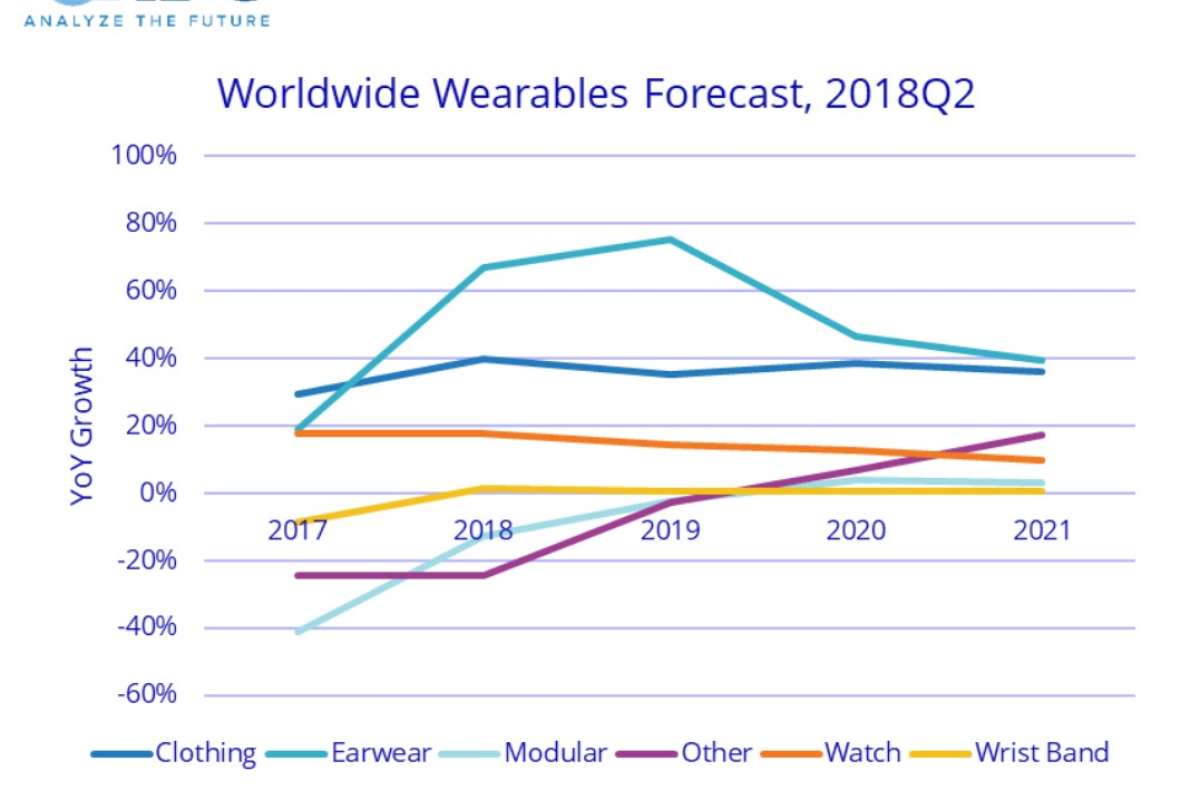 Согласно прогнозу IDC, в 2018 году на мировой рынок будет поставлено 122,6 млн. шт. носимых устройств, на 6,2% больше, чем в прошлом году (115,4 млн. шт.). Это первый год, когда не будет двузначного роста поставок, — главным образом из-за сохраняющейся вялости продаж устройств базового уровня (не использующих приложения сторонних разработчиков). Однако двузначный рост возобновится в 2019 году и сохранится до конца прогнозного периода, так как смарт-часы и новые форм-факторы будут всё шире приниматься рынком. IDC ожидает, что в 2022 году общий объем поставок достигнет 190,4 млн. шт., что означает среднегодовой темп роста (в сложных процентах, CAGR) 11,6% за пятилетний прогнозный период.