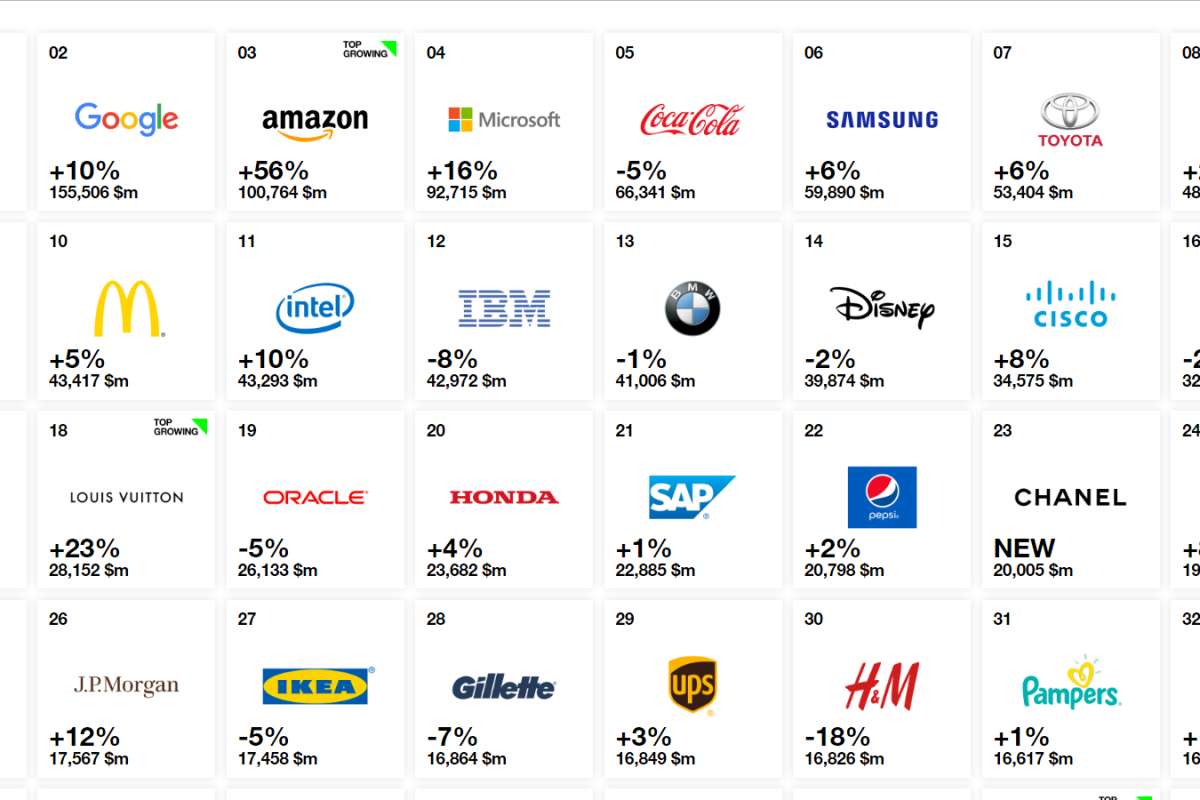 - Microsoft (№ 4, 92,715 млн. долл.) Несмотря на то, что рост стоимости данного бренда за год составил 16%, компания ухудшила свое положение в итоговом списке. Она уступила третье место (на которое ее поставили в 2017 г.) компании Amazon (№ 10 в 2017 г.), показавшей лучшую динамику стоимости бренда. За прошедший год этот высокотехнологичный ритейлер «прибавил» 56%. Таким образом стоимость его бренда в 2018 г. составила 100,764 млн. долл.