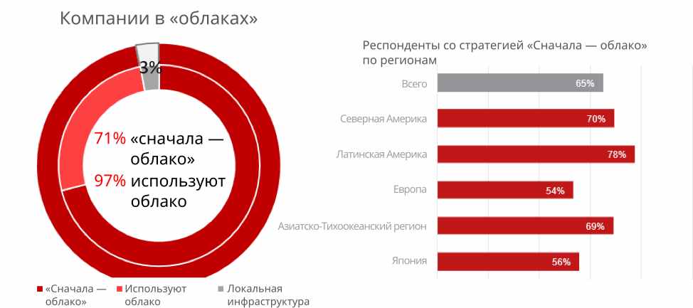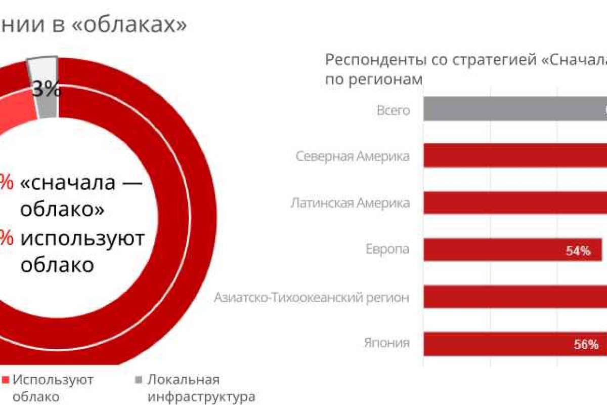 Опрос показал, что 97% организаций в мире используют облачные сервисы — а всего год назад этот показатель составлял 93%. В прошлом году большинство организаций почти во всех крупных регионах зашли так далеко, что для новых инициатив, использующих инфраструктуру или технологические активы, приняли стратегию «сначала — облако».