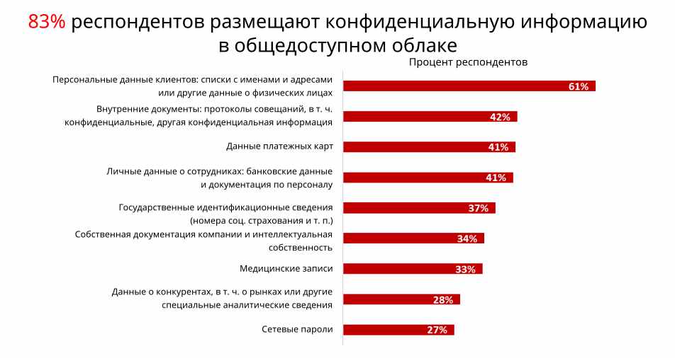 В отчете этого года выделяется интересная тенденция: компании передают поставщикам облачных услуг свои данные в намного большей мере, чем можно было бы ожидать, исходя из уровня доверия этим поставщикам. Конфиденциальные данные в общедоступном облаке хранит невероятно большое число респондентов — 83%, причем многие из них сообщают, что почти каждый из важных типов данных хранится не менее чем у одного поставщика.