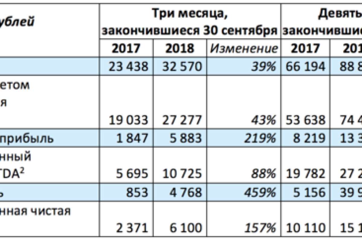 - Чистая прибыль выросла по сравнению с аналогичным показателем за третий квартал 2017 года на 459% и составила 4,8 млрд рублей (72,7 млн долларов США).
