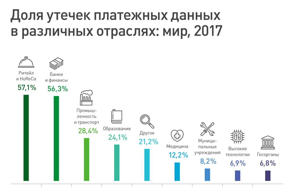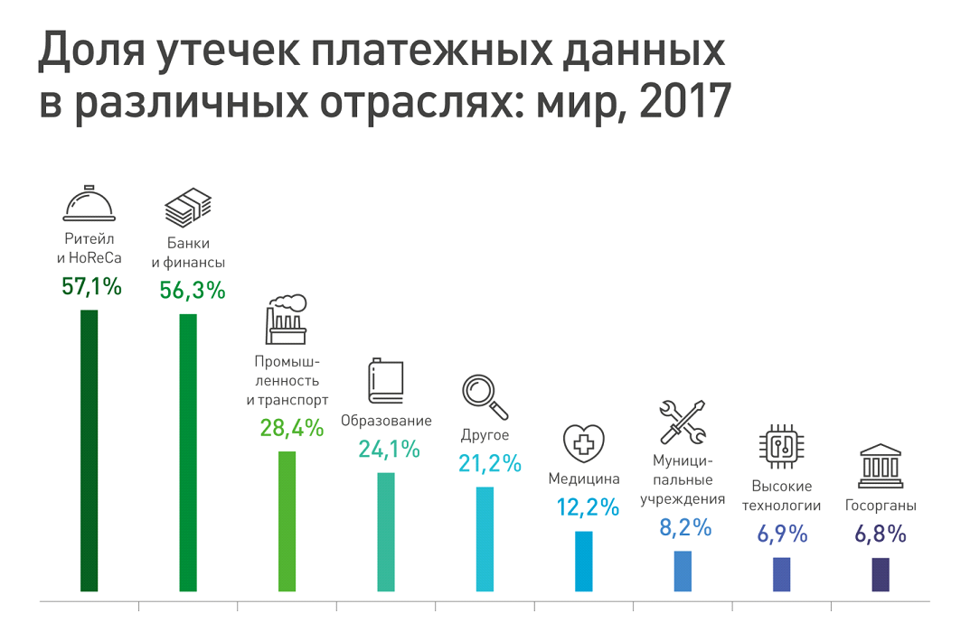 «Доля утечек платежных данных в сегменте ключевых потребительских услуг — розничной торговли, гостиничном бизнесе и общественном питании — сегодня даже выше, чем в организациях финансово-кредитной сферы, которая традиционно считалась главной мишенью для похитителей чувствительной информации, — отметил аналитик ГК InfoWatch Сергей Хайрук. — Резкий рост утечек платежных данных в ритейле связан с тем, что отрасль находится в активной фазе цифровой трансформации, когда внедряются новые формы оплаты и взаимодействия с клиентом, а объемы информации, которые обрабатываются в торговых сетях, отелях, ресторанах и кафе, стремительно увеличиваются. Укрупнение хранилищ таких данных повышает интерес к ним со стороны злоумышленников».