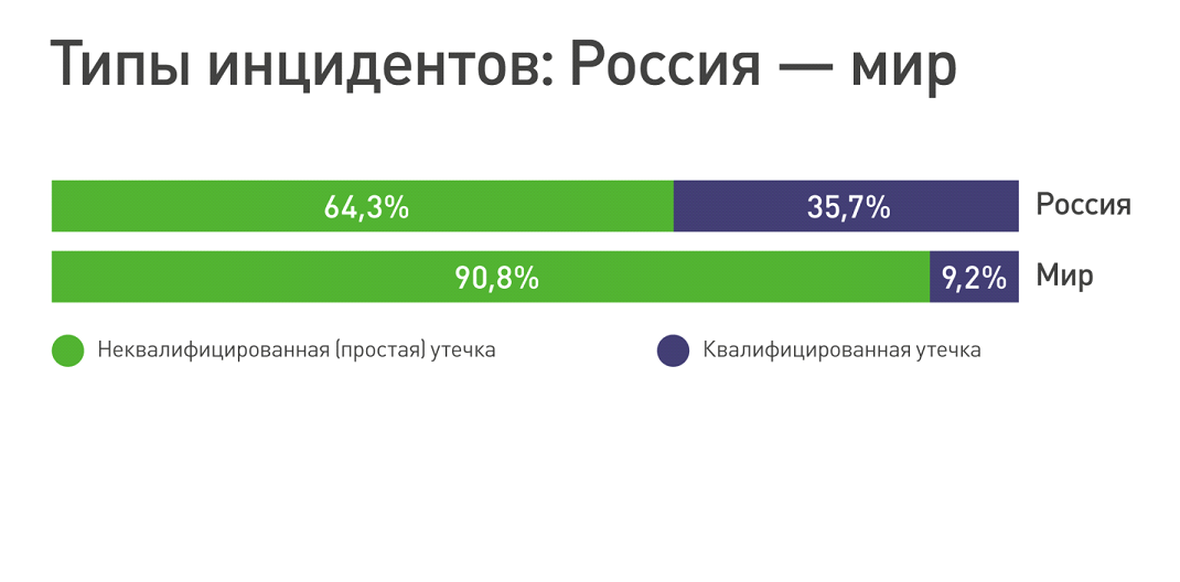 Доля России в общемировой выборке утечек из организаций сфер розничной торговли, гостиничного и ресторанного бизнеса составила около 10%. Все инциденты в исследуемой отрасли, которые были зафиксированы в нашей стране, произошли по вине внутренних нарушителей. На долю умышленных утечек пришлось 42% случаев. При этом в России, по сравнению с мировой выборкой, в два раза выше доля случайных и в четыре раза — квалифицированных утечек. По мнению авторов исследования, большая доля случайных утечек может быть связана с относительно невысоким уровнем цифровой грамотности и кибергигиены как самих пользователей, так и поставщиков товаров и услуг в сфере HoReCa, при этом значительная доля квалифицированных утечек свидетельствует о недостаточности текущих мер и уровня защиты. Кроме того, отметили эксперты, процесс цифровизации российского ритейла все еще находится в стадии становления, так, в половине случаев кража корпоративных данных осуществлялась при помощи бумажных носителей.