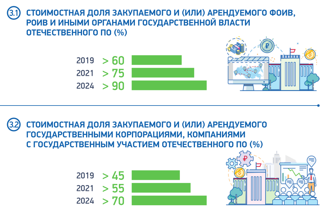 Не случайно поэтому в рамках нацпрограммы к концу 2024 г. стоимостная (даже не количественная!) доля закупаемого и/или арендуемого госорганами отечественного ПО должна превосходить 90%, а та же самая доля для госкорпораций и компаний с государственным участием — превышать 70%. Ещё до конца 2020 г. паспорт «Цифровой экономики» предусматривает определение 18 лидирующих исследовательских центров по направлениям развития «сквозных» цифровых технологий.