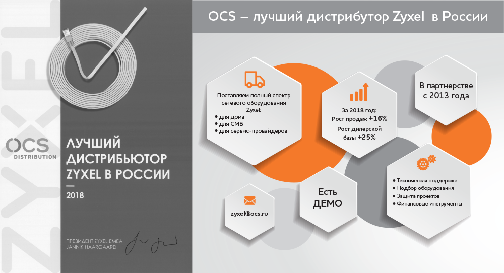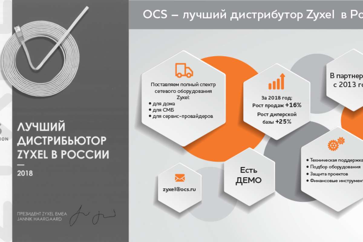 Компания OCS получила звание лучшего российского дистрибьютора компании Zyxel. Данная награда отмечает высокий уровень партнерского сервиса OCS, работу компании не только в центральном федеральном округе, но и в регионах, а также активность в продвижении продукции Zyxel на российском рынке. В ряду преимуществ дистрибьютора и вендором, и дилерами, прежде всего, отмечаются прогнозируемость поставок со стороны OCS, скорость и качество проектной работы, удобство финансовых инструментов и прочих мер по развитию партнерского канала.