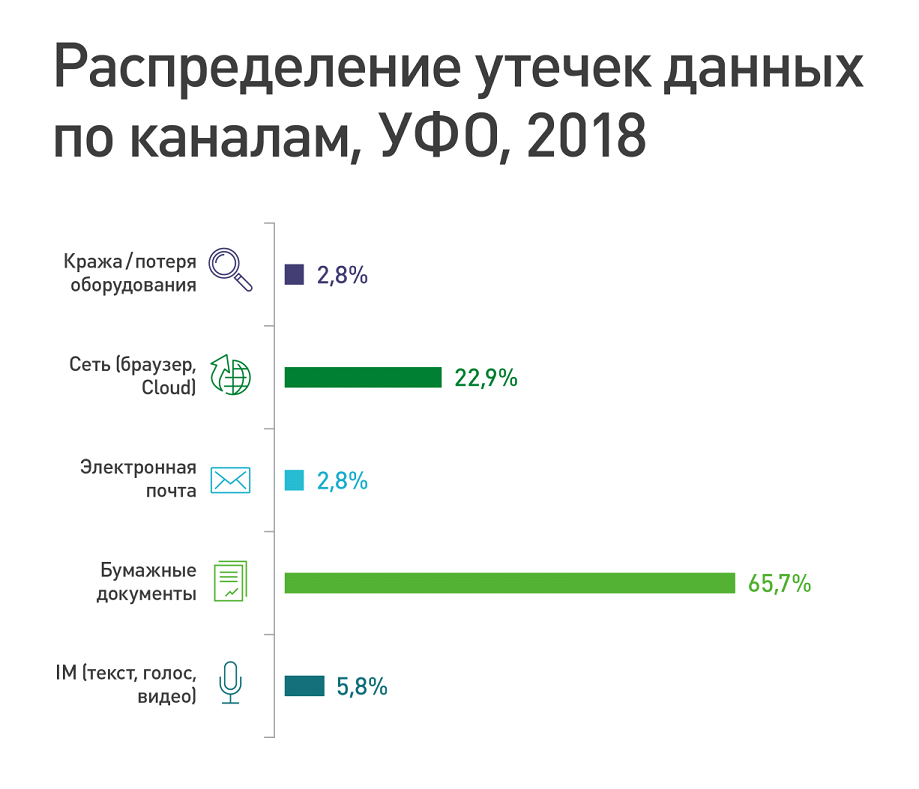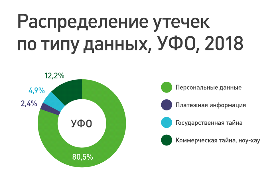 В 2018 году наибольшее количество утечек данных в УФО было зафиксировано в медицинских учреждениях (21%), банковских и финансовых организациях (16%), органах государственной и муниципальной власти (по 12%). Реже всего данные утекали из образовательных учреждений (9%), организаций сферы торговли (9%) и промышленных предприятий (7%).