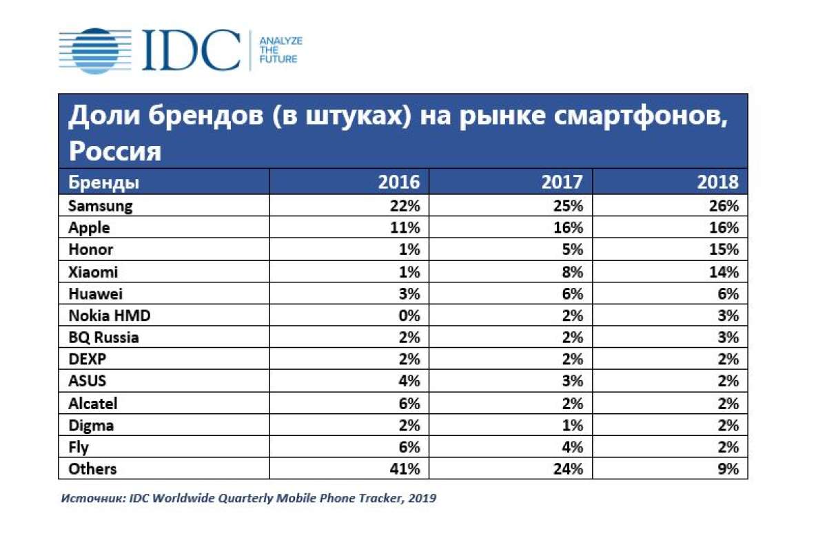 Рост Huawei происходит за счет небольших брендов, а не компании Samsung, которая продолжает удерживать четверть рынка смартфонов. «Российский рынок консолидируется очень быстро», — прокомментировал Саймон Бейкер, директор по программам исследования рынка мобильных телефонов в IDC EMEA. «Добавьте поставки Xiaomi и вы получите почти четыре пятых всех продаж смартфонов на базе Android для трех ведущих игроков. Год назад у тройки лидеров было менее трех пятых. Россия известна как рынок с большим количеством брендов в мобильной индустрии, но мелкие игроки испытывают большие трудности, и некоторые известные бренды находятся под угрозой выхода с рынка», — сказал он.