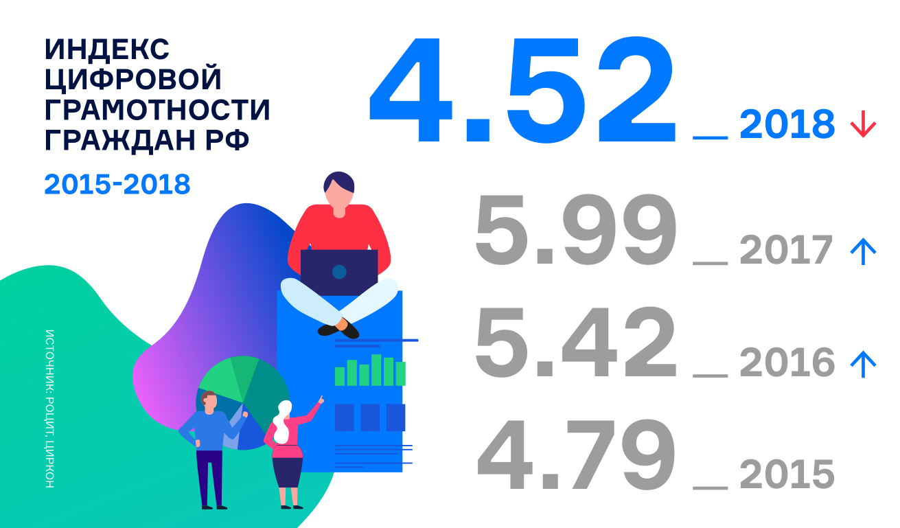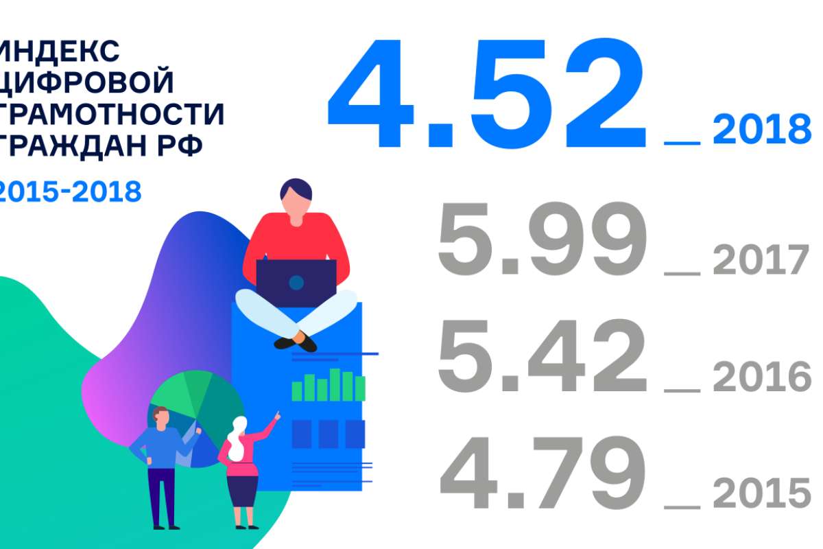 РОЦИТ совместно с исследовательской группой «ЦИРКОН» уже четвёртый год подряд рассчитывает условный показатель осведомлённости россиян в различных аспектах высоких технологий, — так называемый индекс цифровой грамотности граждан РФ. По итогам 2018 г. среднее значение этого индекса по стране составило 4,52 пункта, что на 14,7% меньше в сравнении с
