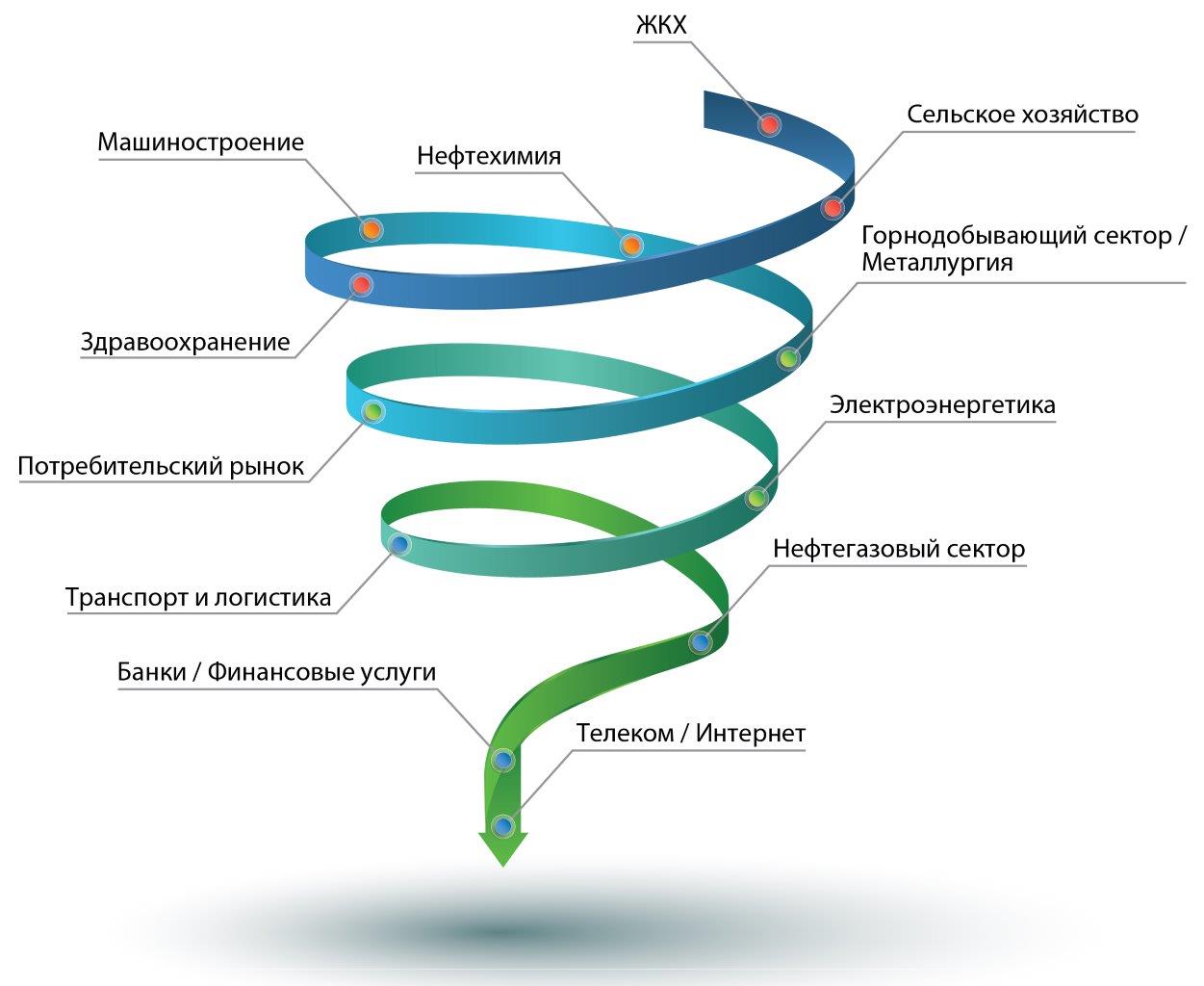 Для визуализации результатов опроса экспертов была использована модель «Цифровой воронки»: она показывает, какие отрасли российской экономики — в числе лидеров по внедрению интернета вещей (IoT), а какие, напротив, являются аутсайдерами. Критериями оценки стали сложность IoT-проектов, их масштаб, текущие результаты и перспективы внедрения. Воронка состоит из четырех витков, в центре — отрасли с высоким уровнем цифровизации, на внешнем круге — наименее технологичные, только вступающие в «воронку цифровизации».